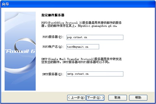3.如上图所示,点击“下一步”按钮,在pop3服务器输入框中输入: pop.cstnet.cn 在POP3帐户名输入框中输入邮件地址全称:test@myunit.cn,在SMTP服务器输入框中输入:smtp.cstnet.cn,如下图示: