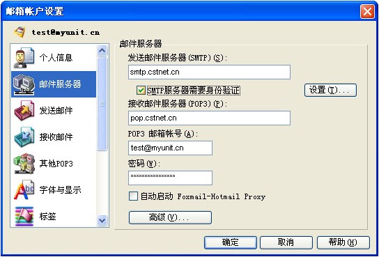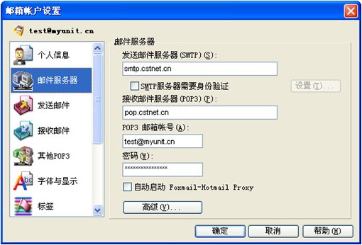 提示:本说明中所使用的版本为Foxmail6.0简体中文版,并以test@myunit.cn 做为邮箱地址,其中以test作为用户名,myunit.cn作为域名来进行制作,请按照下边方法进行设置时将test@myunit.cn替换为您的邮箱地址。